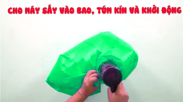 Bước 2: Cho quần áo đang ẩm vào túi ni lông đã cắt. Sau đó cho máy sấy tóc vào túi, túm kín và khởi động máy sấy.