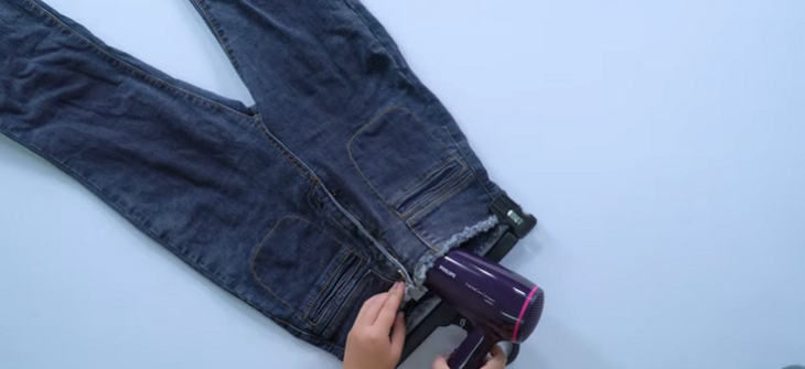 Bước 2: Luồn máy sấy tóc vào bên trong quần jean và khởi động máy.